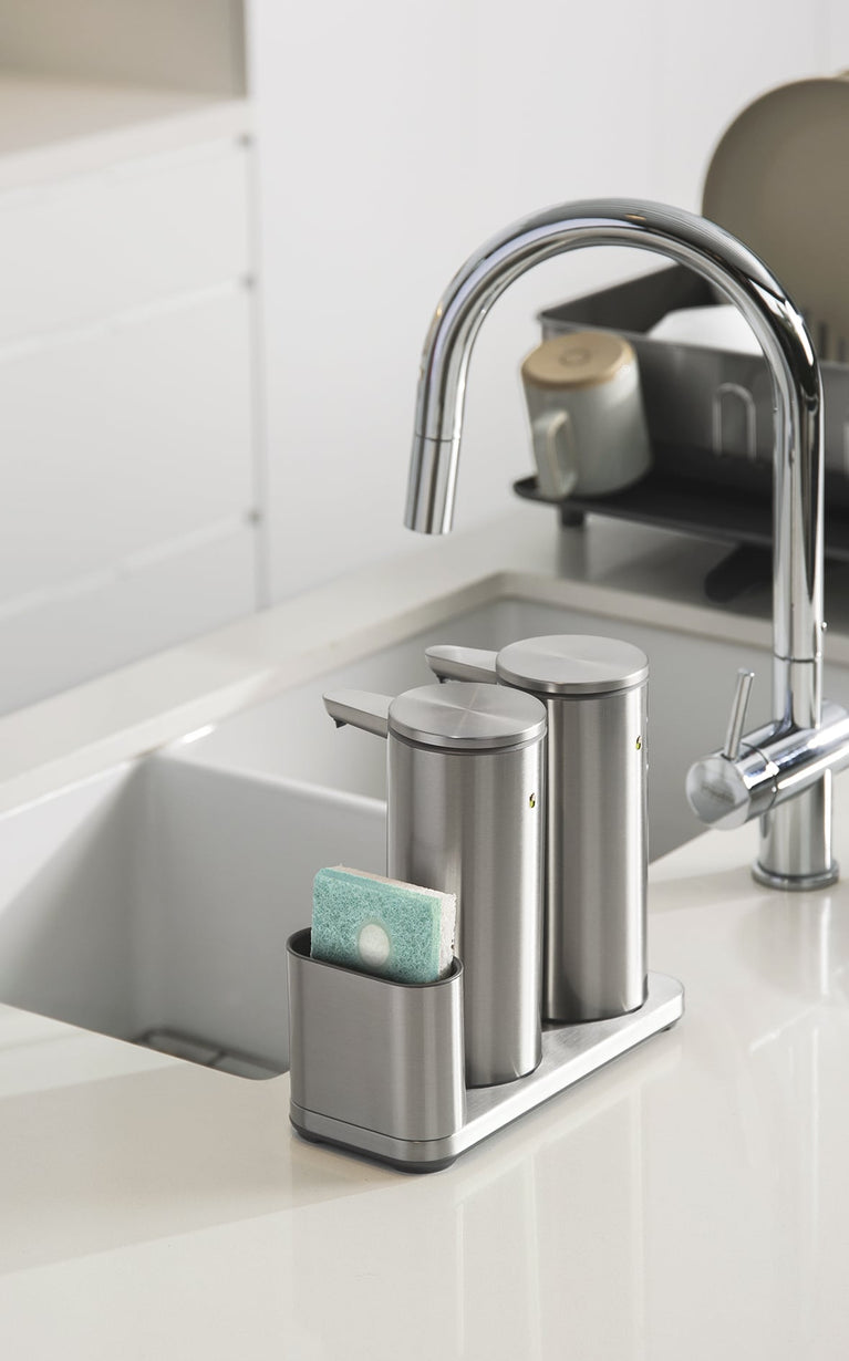 De pomp met sensor met houder is het ultieme afwasstation. Netjes, ruimtebesparend en o zo stijlvol.