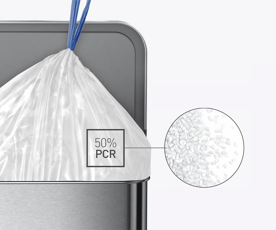 Onze duurzame afvalzakken, die voor 50% uit PCR-plastic (Post-Consumer Recycled) bestaan, zorgen ervoor dat er minder materiaal op stortplaatsen en in oceanen belandt en dat er minder koolstof in de atmosfeer terechtkomt.