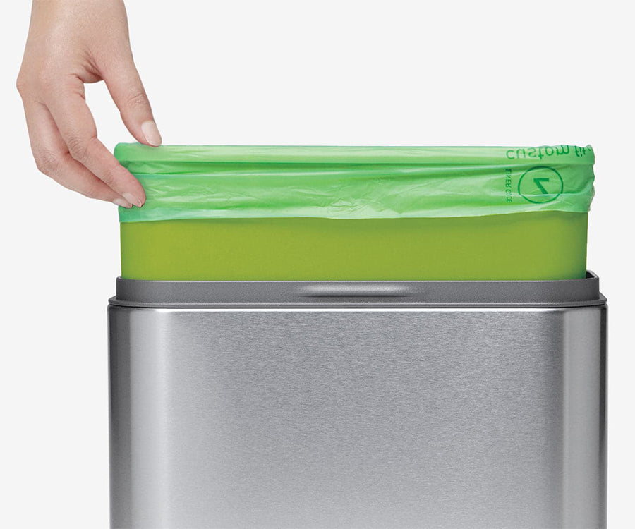 Onze composteerbare code Z-afvalzakken op maat passen precies in het compostbakje, zodat ze niet wegglijden en netjes uit het zicht blijven als het deksel gesloten is.