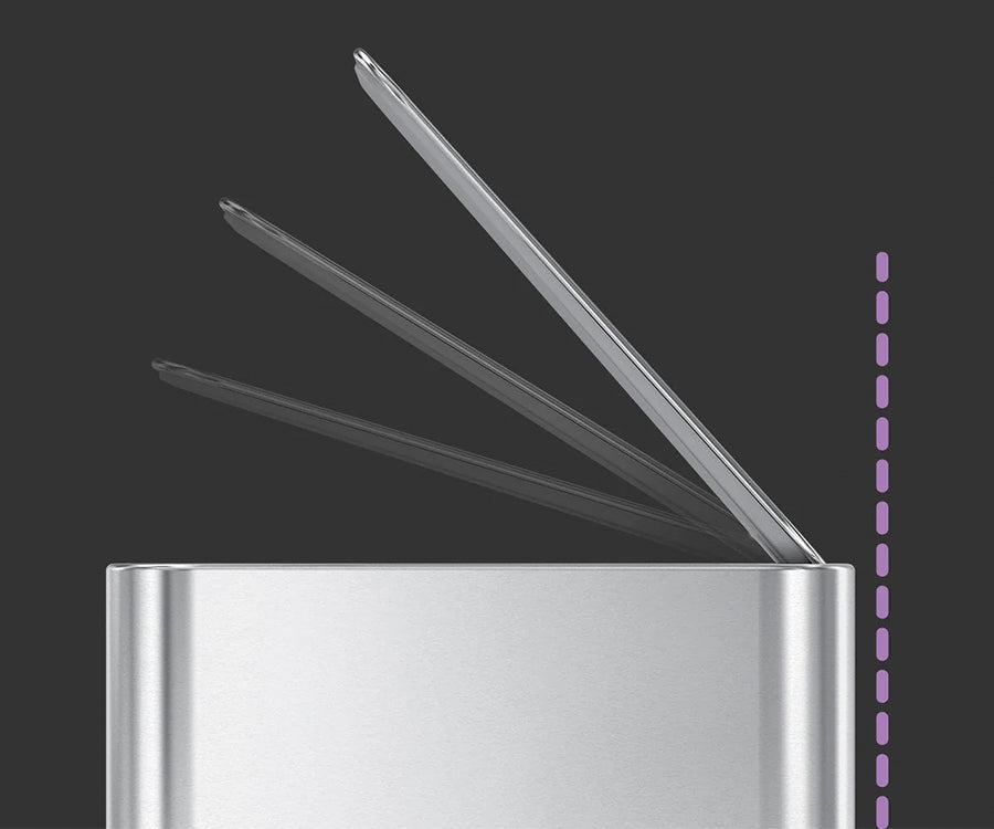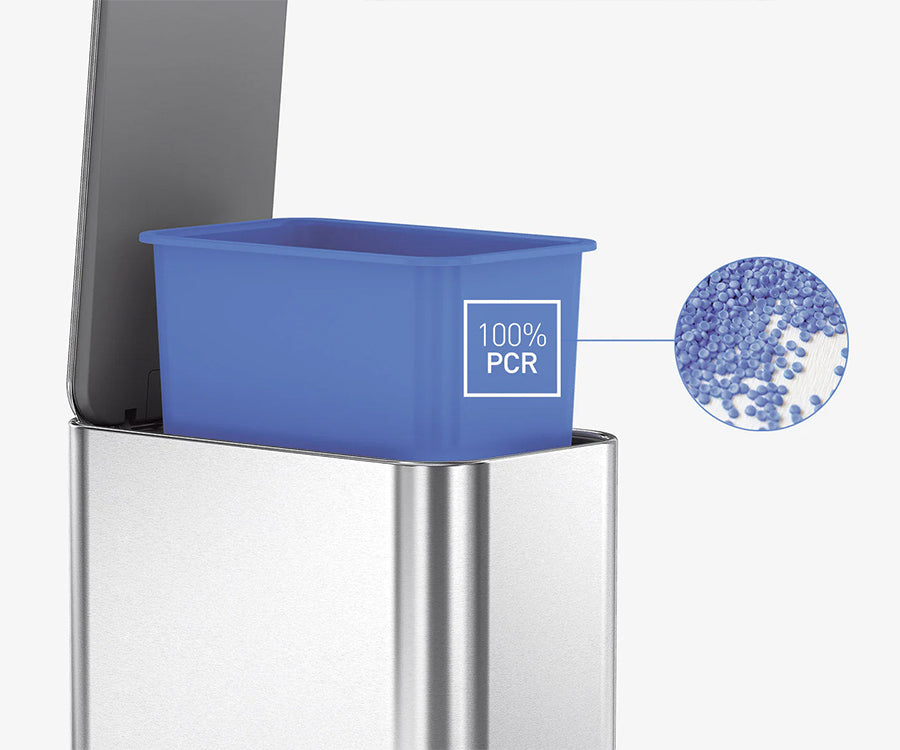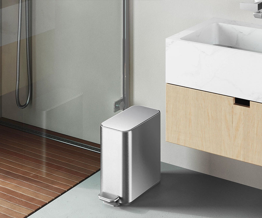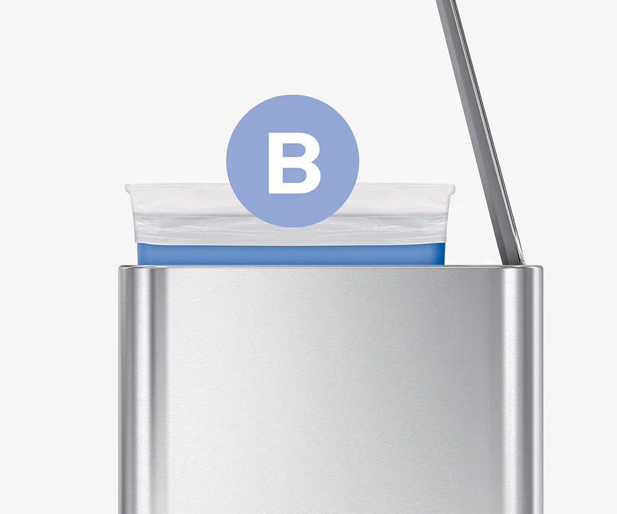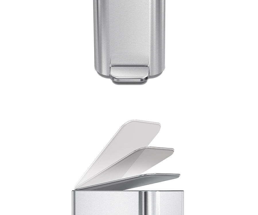Een compacte afvalbak met de functies en kwaliteit van een grote afvalbak. Het slanke ontwerp biedt voldoende capaciteit en past desondanks in een krappe ruimte. Het slanke interne scharnier maakt het mogelijk om de pedaalemmer recht tegen de muur te zetten.